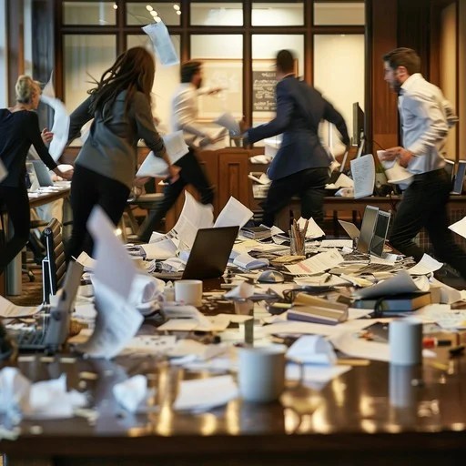 Čovjek sa do lakta zavrnutim rukavima na plavoj košulji, malo otpuštene kravate i flekama od znoja, žena sivog lica s pomalo razmazanom šminkom i osmijehom br.36, gomila papira, fascikala u bojama, posuda od gableca, iscrpljen čovjek nad kopirkom, tamo hvata malo udisaja, malo dalje na shredderu papira uništavaju neke dokumente, kao da imaju last minute dojavu da upravo stižu FBI i IRS, kao u filmovima.